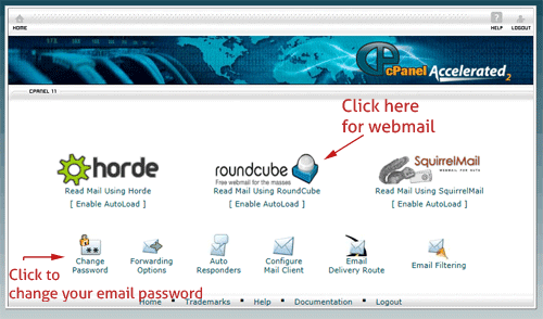 Once you enter this information, you will be shown your Email Control Panel - you can then check your email via RoundCube, change your password, or adjust your anti-spam.