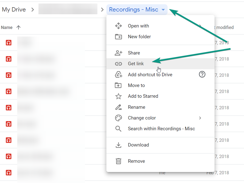 - Beside the folder name, click the little arrow that points downwards. Click "Get Link".